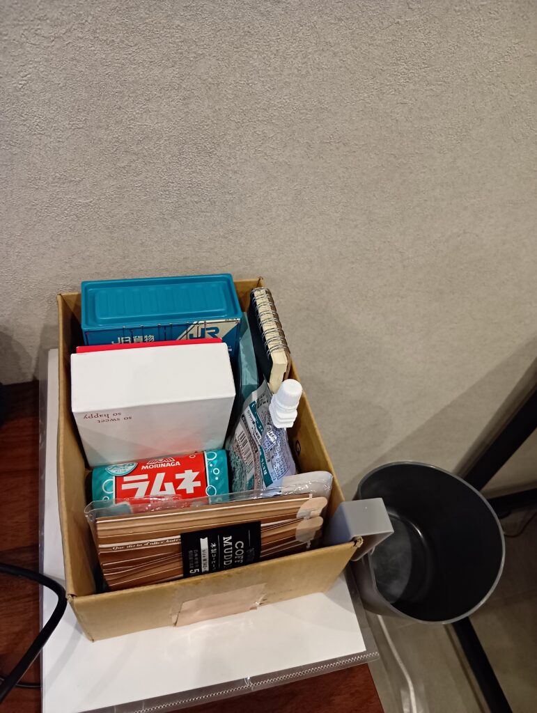 このボックスは、僕の趣味である鉄道のコンテナや六花亭のお菓子箱があったり、メモ帳や付箋やマドラー時にはラムネのウィダーインゼリーが入ってたりしています。この鉄道のコンテナの中身は、ラムネとココアとなっています。ほかにもチョコやクッキーなど入っています。